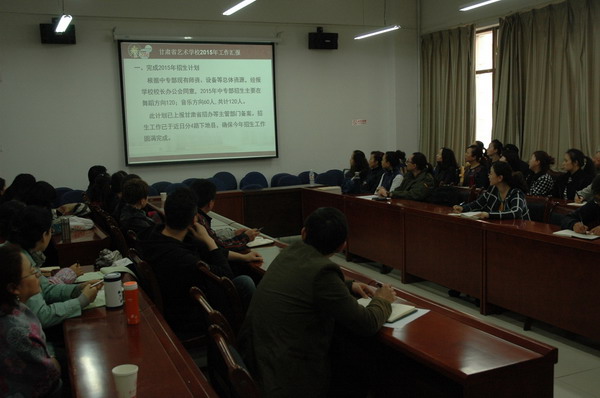 张世成同志代表中专部就2014年主要工作做了总结,对2015工作计划做了汇报。其他班子同志和参会教师就中专部师生的思想、党建、员工管理、团队队伍建设、戏曲专业建设、敦煌舞蹈专业的特色创新以及音乐专业建设和乐队工作等做了发言。