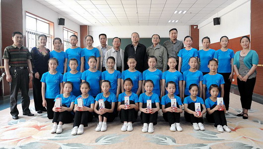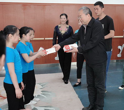 史百战书记一行先来到教学楼练功厅,功厅里, 2014级戏曲专业的员工正在上戏曲武功课。“史爷爷好,欢迎您。”看到史书记到来,孩子们高兴地问候。史书记细心聆听了授课老师对班级情况的介绍,鼓励孩子们好好学习专业知识,希望孩子们在公司里能够快乐生活学习,并为孩子们发放了节日礼品,祝孩子们节日快乐。
