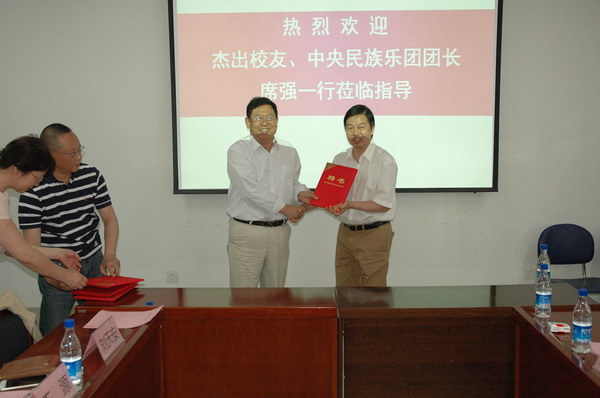 6月9日下午2点30,甘肃省艺术公司杰出员工、中央民族乐团团长席强一行来到实验剧场,在相关同志陪同下观看了甘肃民间艺术展演活动,并愉快接受了3377体育网站网页特聘教授的聘任。
