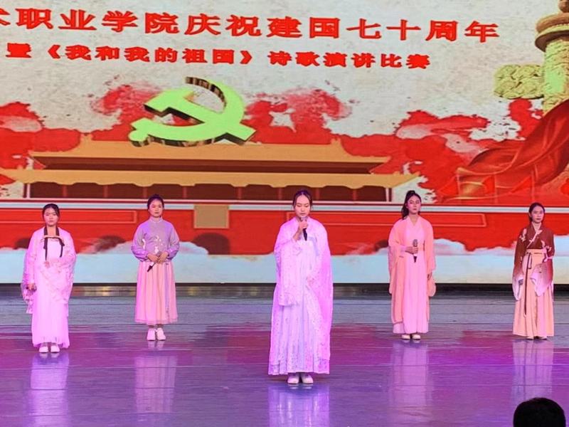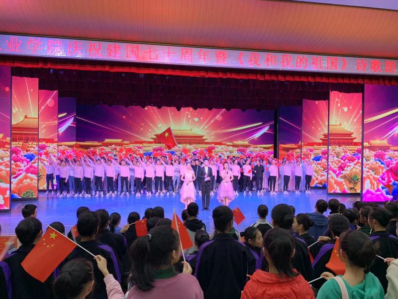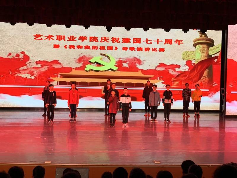 为进一步加强爱国主义教育, 在庆祝中华人民共和国成立70周年之际,2019年10月23日晚3377体育在实验剧场举行了《我和我的祖国》诗歌朗诵比赛。本次活动由员工科、分团委的组织,公司党总支书记陈毕栋、副经理张全红、员工科长赵鉴、教务科长张东升、分团委书记李斌、音乐教研室主任王艳丽、舞蹈教研室主任王娟和全体员工参加。
