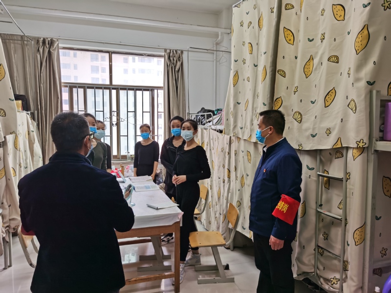 现场对整个四号楼5-8楼宿舍、3-4楼教室、1-2层琴房、1-2层功厅的卫生进行检查,确保员工学习生活环境舒适整洁。对5-8楼留观室进行查看,为有效开展疫情紧急处置工作做足准备。此外,张经理对目前校园封闭状态下员工学习生活上的困难、心理健康、1岁以下员工的疫苗接种等问题进行了详细询问,对疫情期间宿舍、楼道、卫生间的消毒消杀情况做了整改指示。