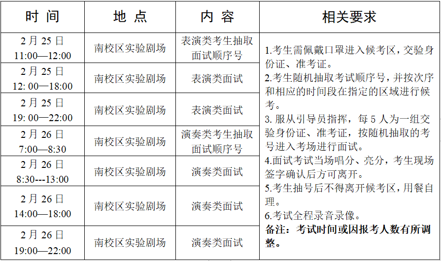 备注:考生入场前准备好考试所需乐器、服装等考试用具,在抽取面试顺序号进入候考区后不得擅自离场;用餐自备。