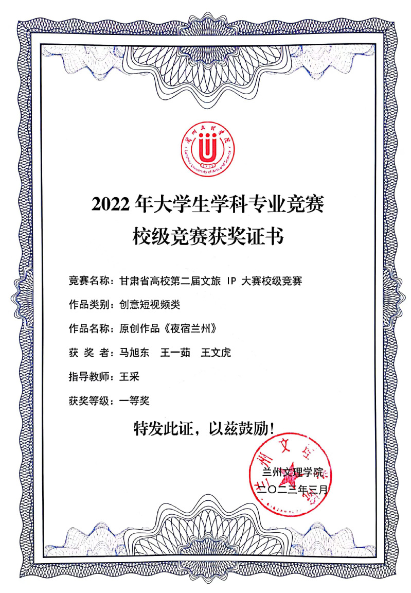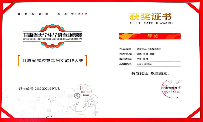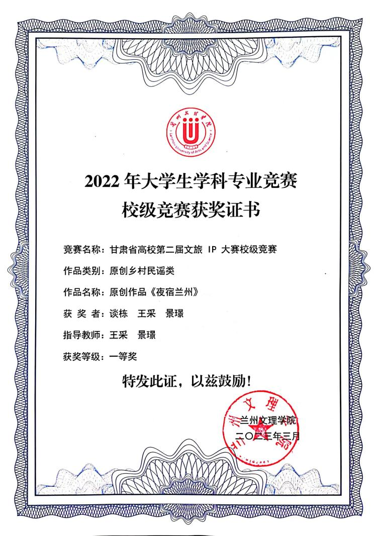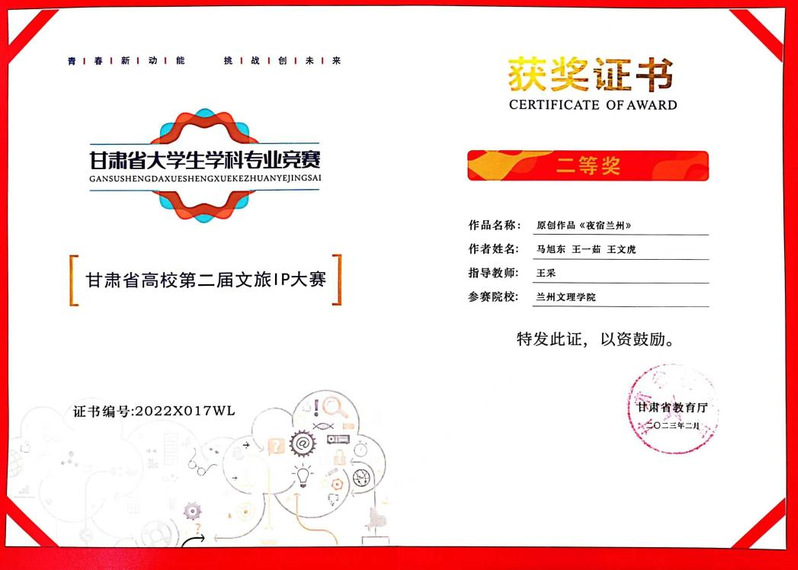 由甘肃省教育厅主办的甘肃省老员工学科专业竞赛甘肃省高校第二届文旅IP大赛中,公司王采教授指导创作的原创歌曲《夜宿兰州》荣获原创乡村民谣类一等奖和创意短视频二等奖。
