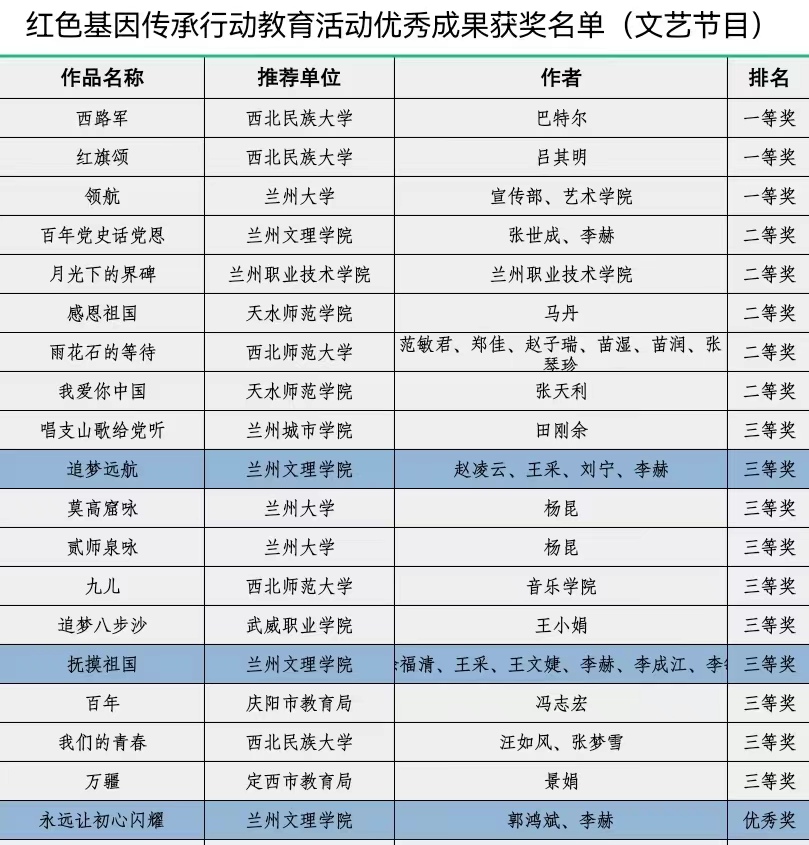 由甘肃省教育厅主办的“红色基因传承行动教育活动优秀成果”评选活动中,公司王采教授作曲创作的音乐作品《追梦远航》(作词:赵凌云、演唱:刘宁、编曲:李赫荣获三等奖;王采教授作曲创作的音乐作品《抚摸祖国》(作词:徐福清、演唱:王文婕、编曲:李赫荣获三等奖;党总支书记郭鸿斌作词创作的音乐作品《永远让初心闪耀》(作曲、编曲:李赫)荣获优秀奖。