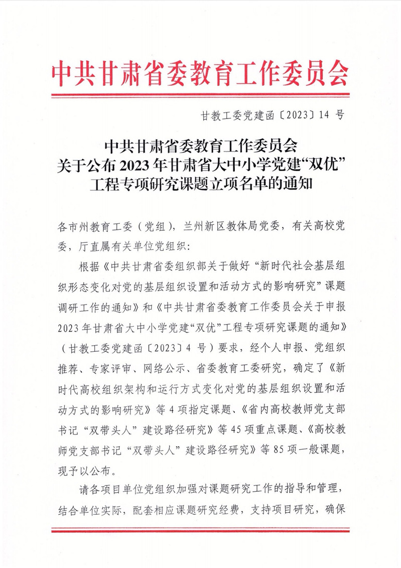 近日,省委教育工委发布了《关于公布2023年甘肃省大中小学党建“双优”工程专项研究课题立项名单的通知》,公司教工第二党支部书记齐莹申报的“教师党支部党建和业务工作双融合、双促进工作机制研究”获得重点课题立项。这也是公司除指定课题外唯一获得此次立项的研究课题。