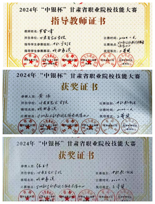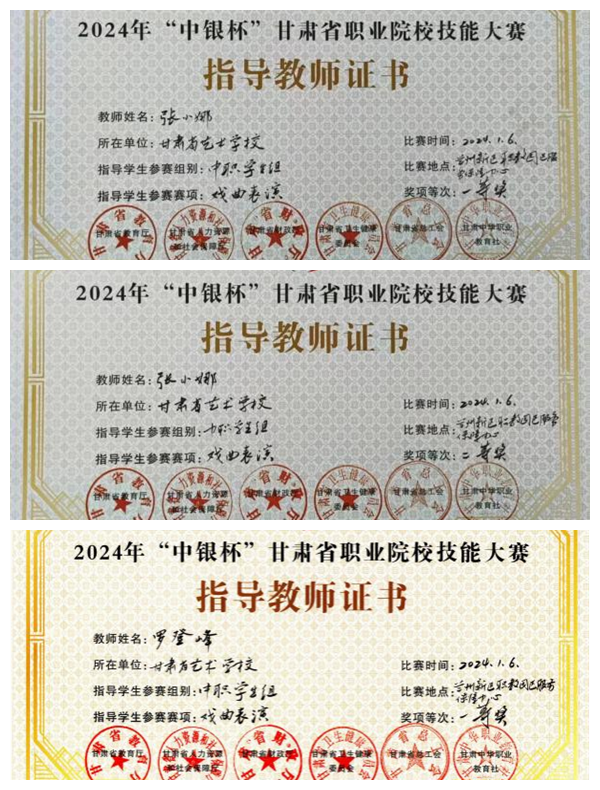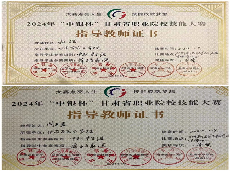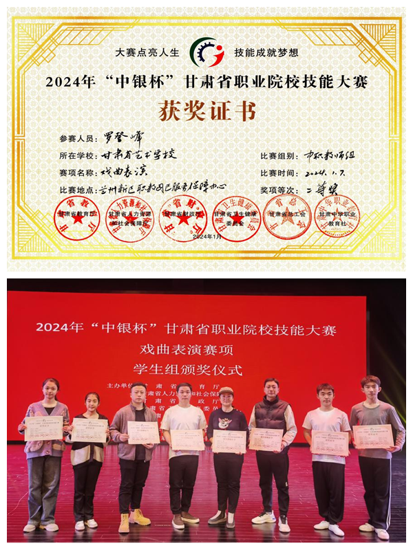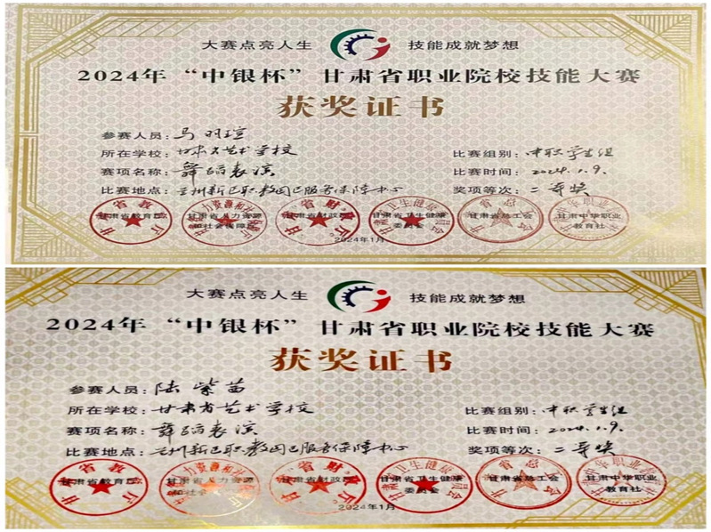 2024年“中银杯”甘肃省中职院校技能大赛由甘肃省教育厅、甘肃省人力资源与社会保障厅、甘肃省财政厅、甘肃省卫生健康委员会、甘肃省总工会、甘肃省中华职业教育社等六个部门联合举办,于2024年1月5日至20日在新区职教园区举行。公司按文件要求推荐12名同学、3名教师代表公司参加了教师个人赛、员工舞蹈和戏曲表演三个单项专业技能项目的比赛。