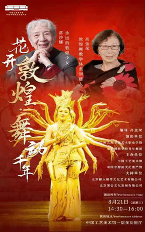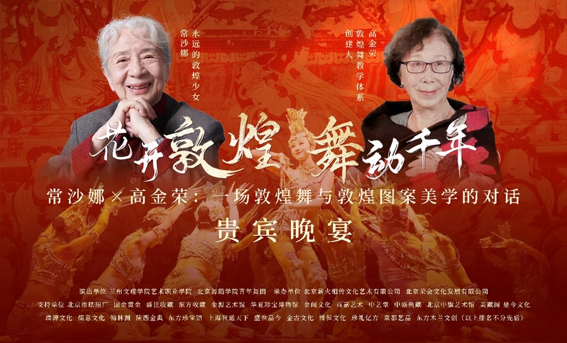 “花开敦煌·舞动千年”展示了两位90岁高龄的艺术家常沙娜先生和敦煌舞教学体系创建人高金荣先生的首次艺术合璧。活动是“花开敦煌--常沙娜从艺八十年艺术与设计展”和高金荣先生的敦煌舞蹈在艺术舞台上的完美融合,全面展现常沙娜先生的艺术生涯,传承敦煌文化。敦煌舞蹈展现出敦煌文化的动态美丽与常沙娜先生静态的艺术设计展遥相呼应、相得益彰,两位大师的艺术追求紧密相连,共同构筑敦煌艺术的灿烂辉煌。
