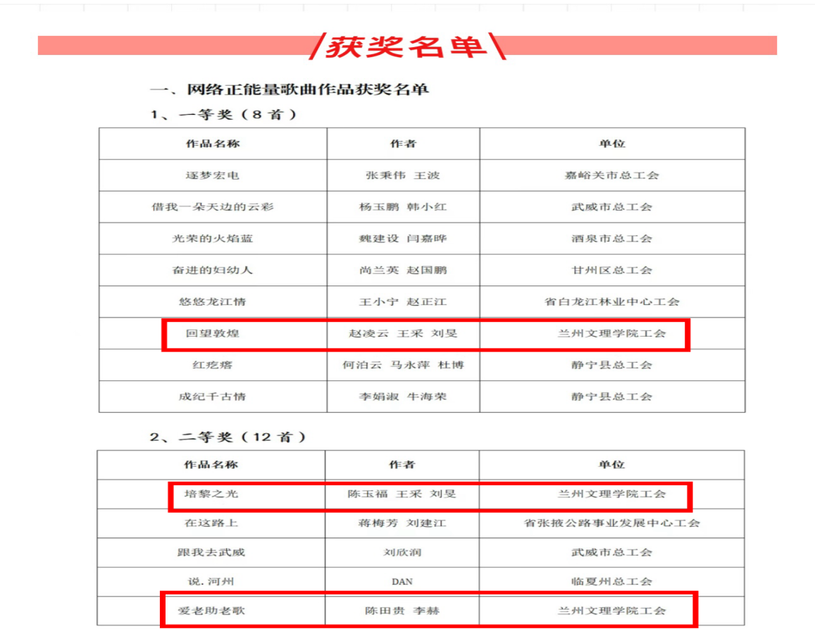 近日,由甘肃省总工会、甘肃省委网信办主办的2024年“网聚职工正能量 争做甘肃好网民”主题活动作品评选结果揭晓。经过层层遴选、专家评审,公司推送的两首作品获奖。由王采作曲、赵凌云作词创作的歌曲《回望敦煌》获歌曲作品类一等奖;王采作曲、陈玉福作词创作的歌曲《培黎之光》获歌曲作品类二等奖。