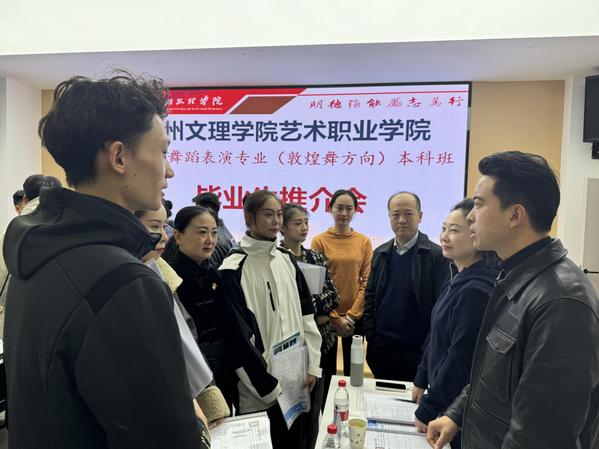 副经理金亮介绍了毕业生的整体情况,党总支书记王宏勉励员工要认清就业形势、放平就业心态积极转变就业观念,珍惜每个就业机会。来自甘肃省歌剧团、甘肃省民族歌舞团、陕西省歌舞剧院等多家艺术团体与毕业生进行了洽谈、沟通、交流,为毕业生提供优质的工作机会,打造院校共育平台,共同推动公司就业工作落地做实。