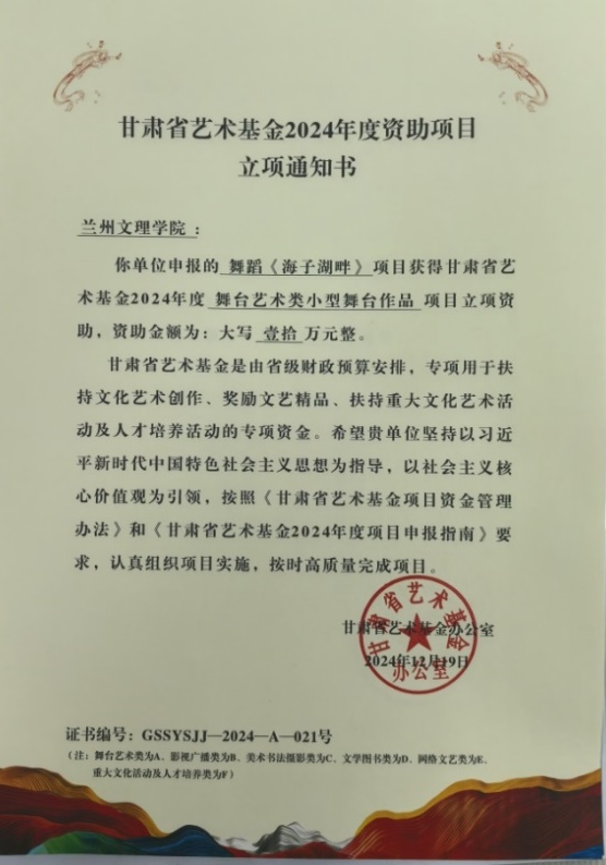 20241219日,甘肃省文化和旅游厅公布了甘肃省艺术基金2024年度资助项目名单,公司教师潘扬弘一原创舞蹈作品《海子湖畔》成功获批甘肃省艺术基金立项。