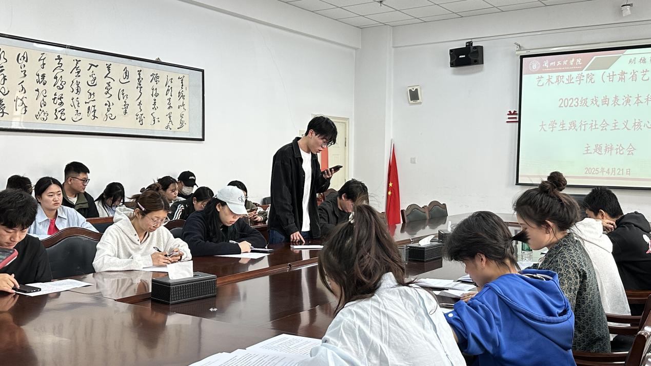 2025年4月21日下午,3377体育2023级戏曲表演本科班举办“老员工践行社会主义核心价值观,知和行哪个更重要”主题辩论会,旨在引导员工理解其认知与实践内涵。辩论会前,第二班主任普登学到场与师生探讨“知”“行”的意义。
