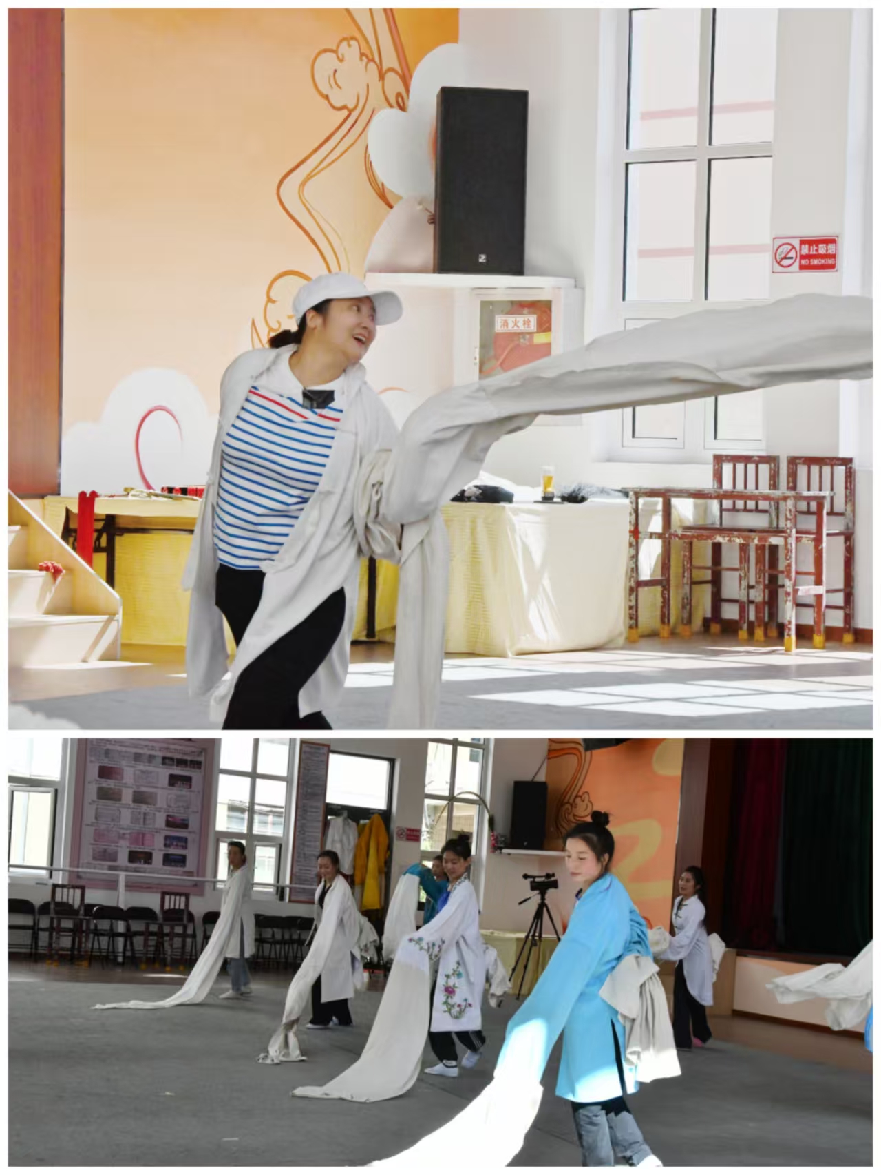 理论讲解结束后,张老师带领学员们进行了舞台实践。她亲自示范水袖功的基本动作,从抖袖、抛袖到收袖水袖的基本动作到复杂的组合技巧,每一个动作都轻盈优美、规范标准优美流畅。